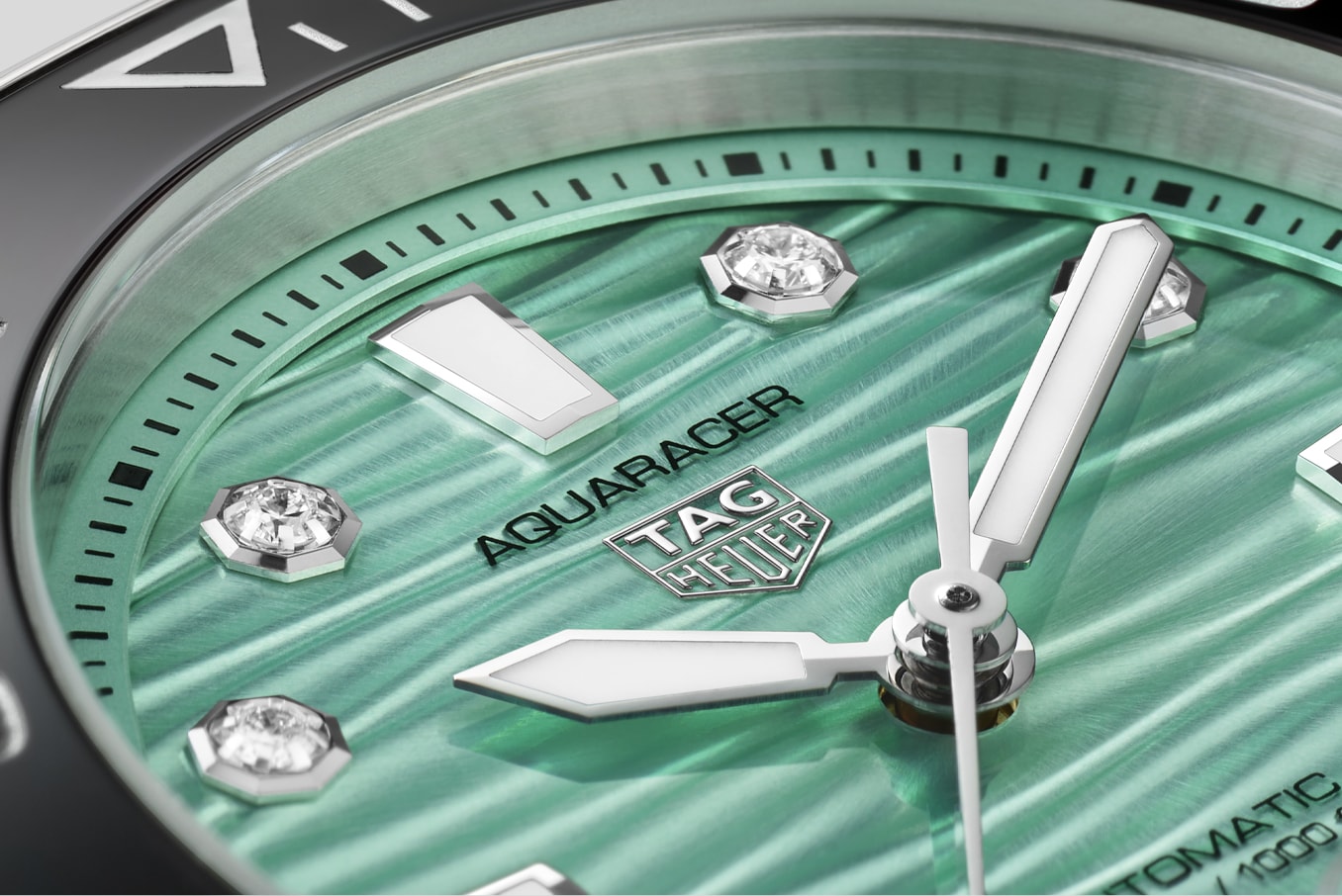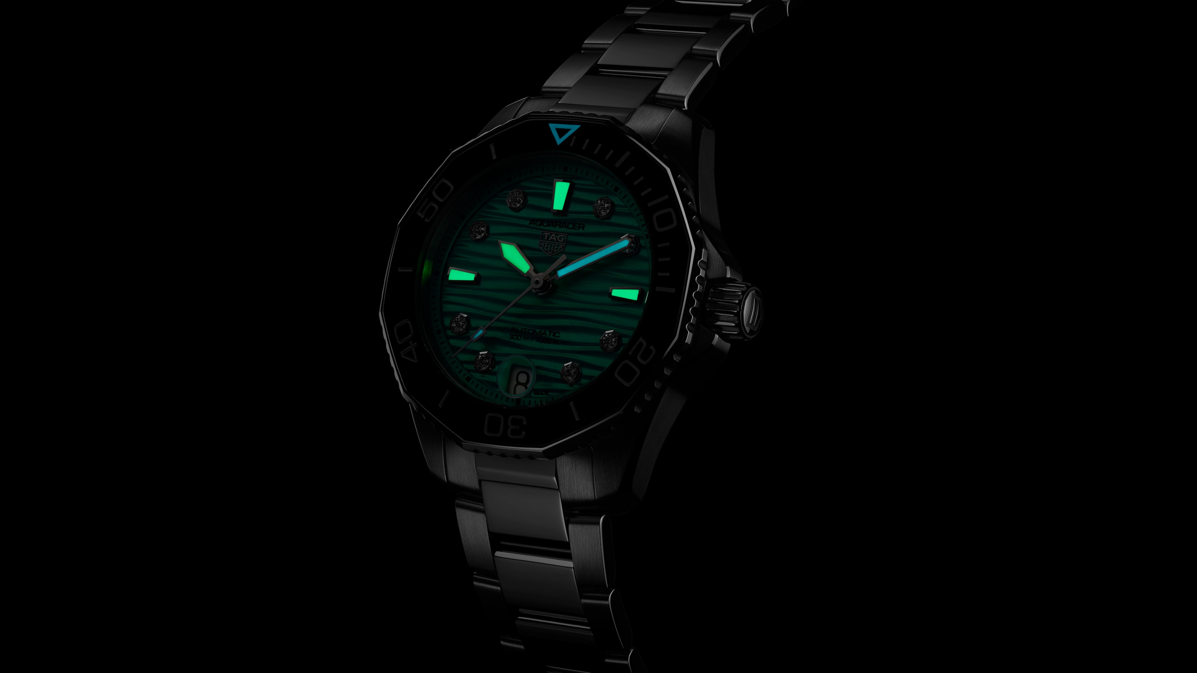 Paying tribute to warm waters, the wavy turquoise dial of this TAG Heuer Aquaracer professional 300 shows eight superb VS 1.4mm-diametre diamonds (0.078ct).